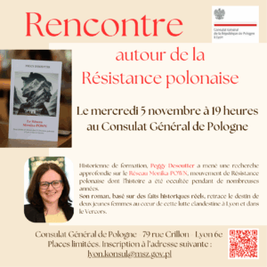 MERCREDI 4 NOVEMBRE 2025 à 19 heures : Peggy Desoutter donnera une conférence en lien avec son roman Le Réseau Monika-Pown au Consulat de Pologne. J’aurais le plaisir de coanimer cette soirée et de lire quelques extraits de ce premier roman. Entrée libre uniquement sur réservation.